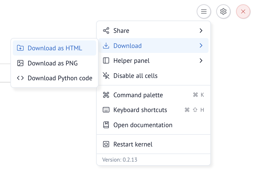 marimo supports context-sensitive right-click menus in various locations of the editor. Right-click on a cell to open a context-sensitive menu; right click on the create-cell button (the plus icon) to get options for the cell type to create.